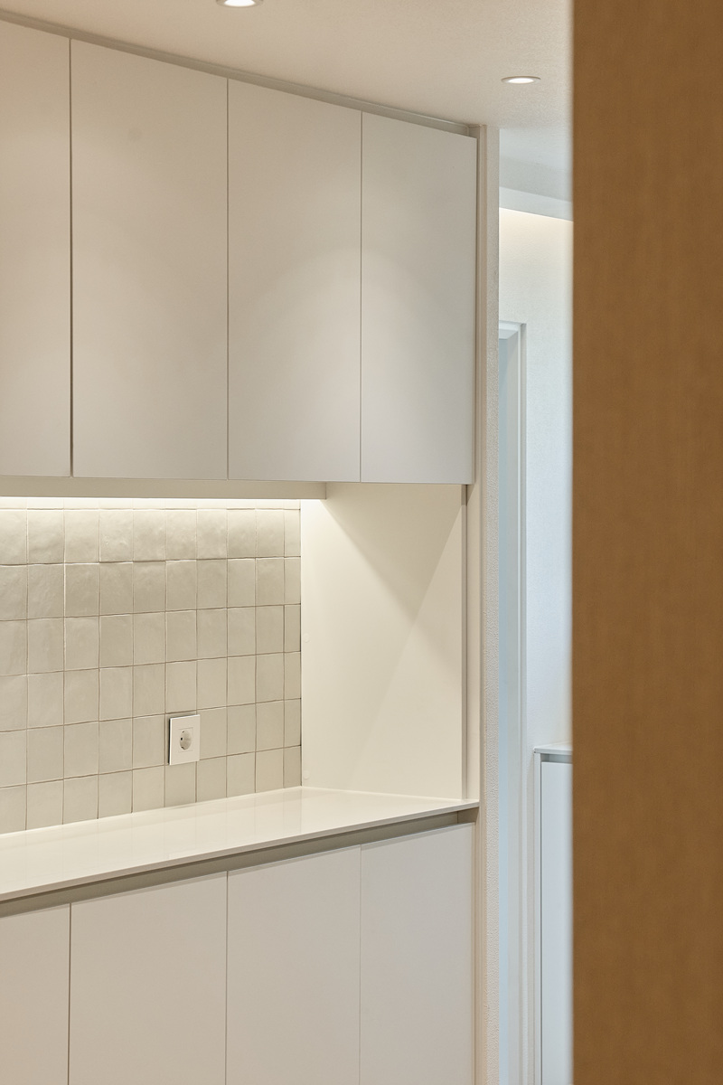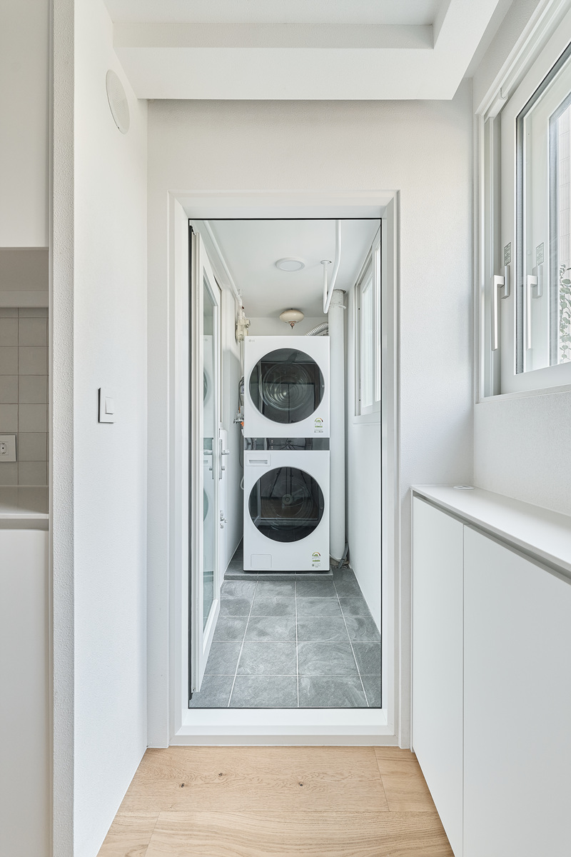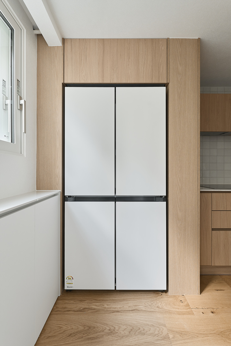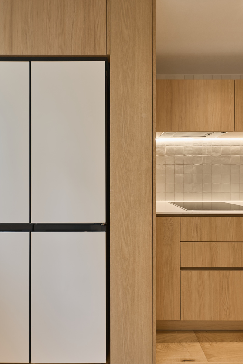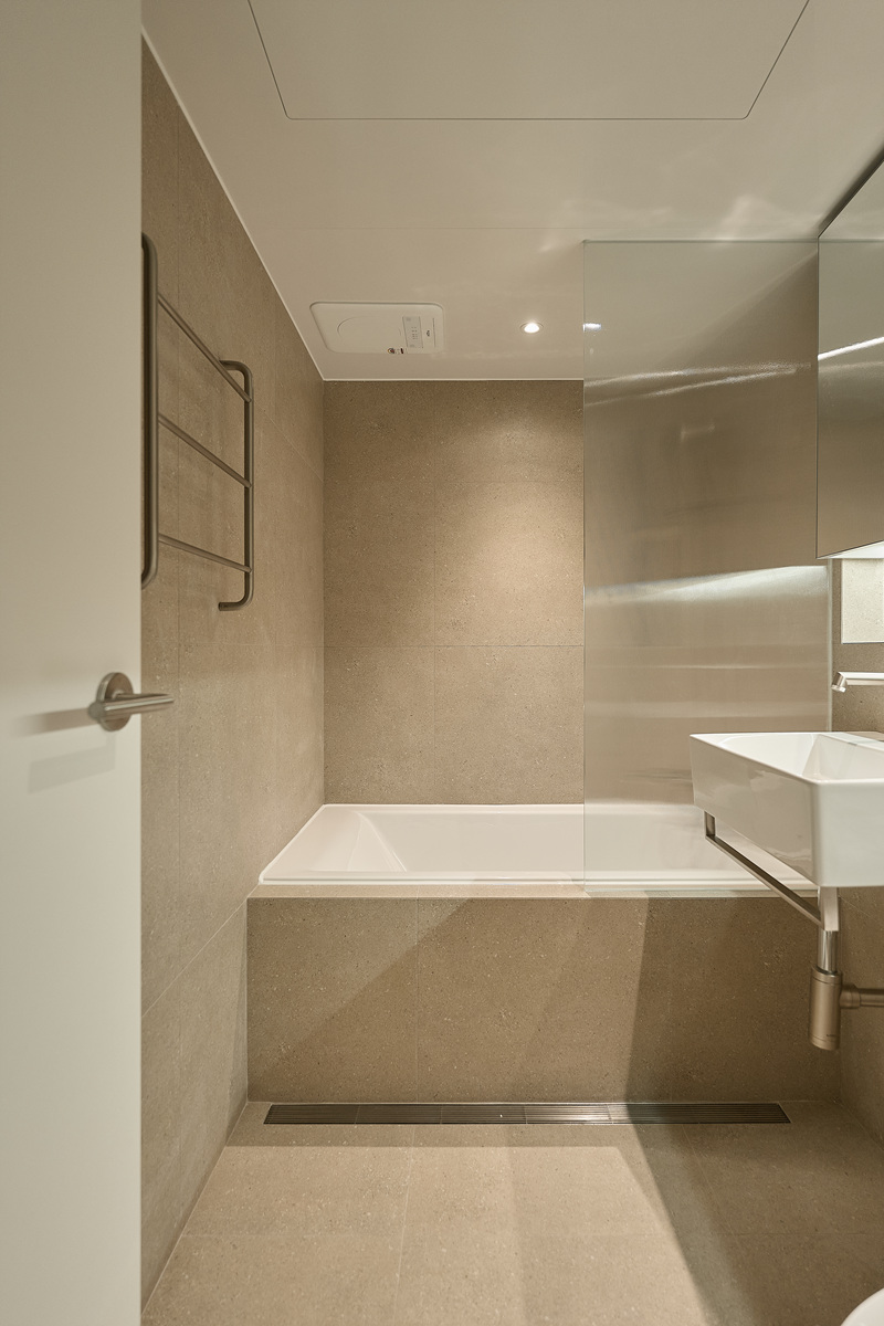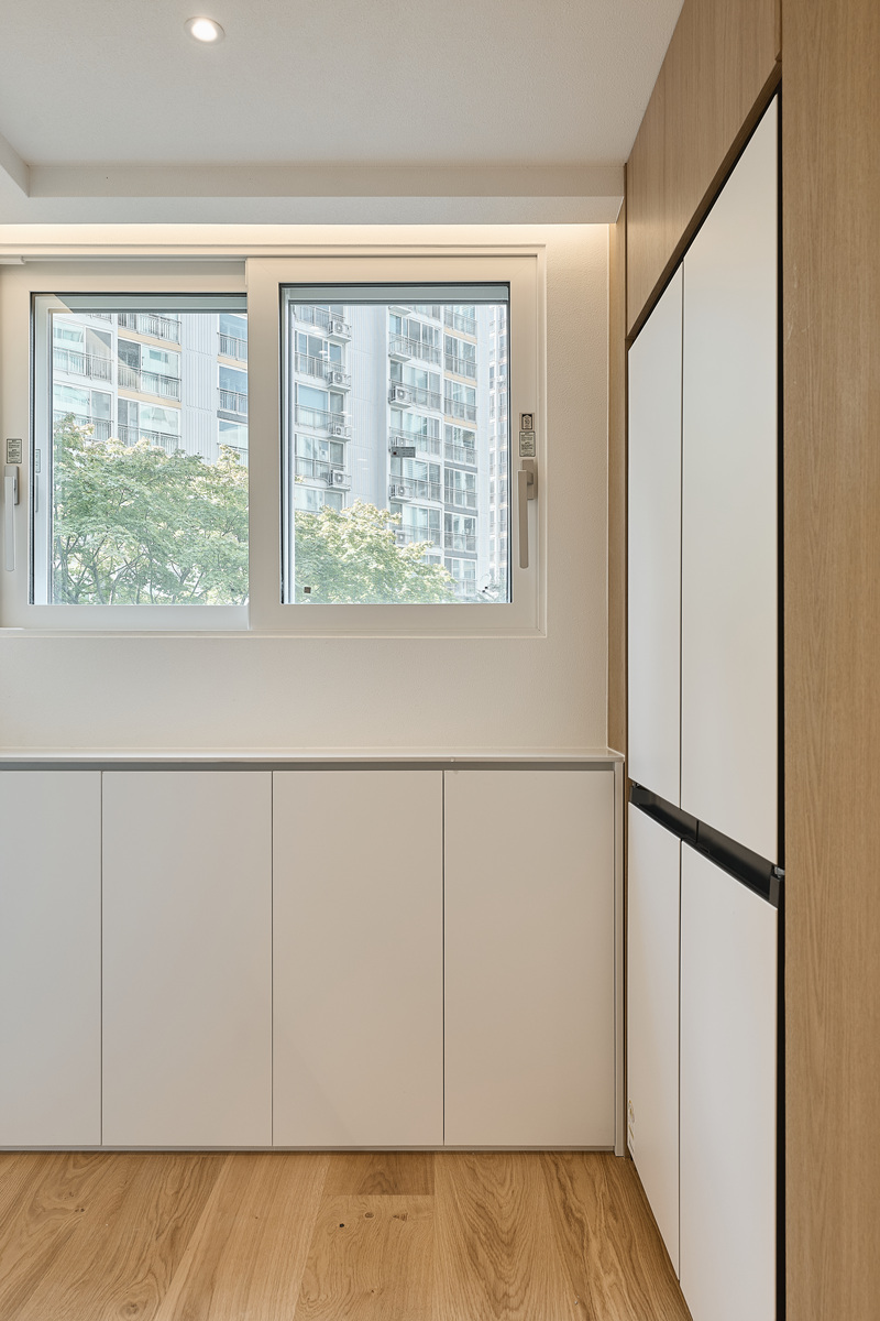 무몰딩의 미니멀한 공간감 속 촉촉한 무드의 유악타일, 따뜻한 촉감의 원목마루 등 자연스러운 소재들을 활용한 따듯한 무드의 22py 아파트 인테리어