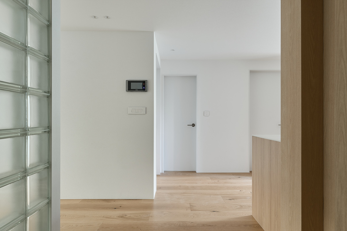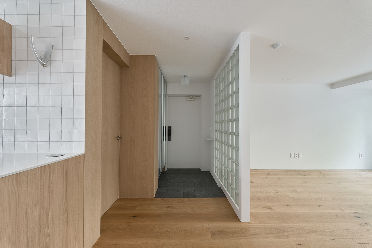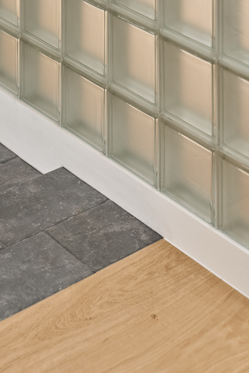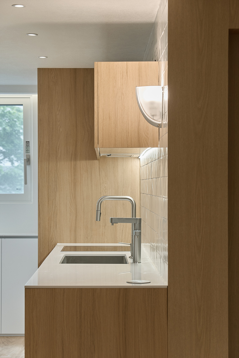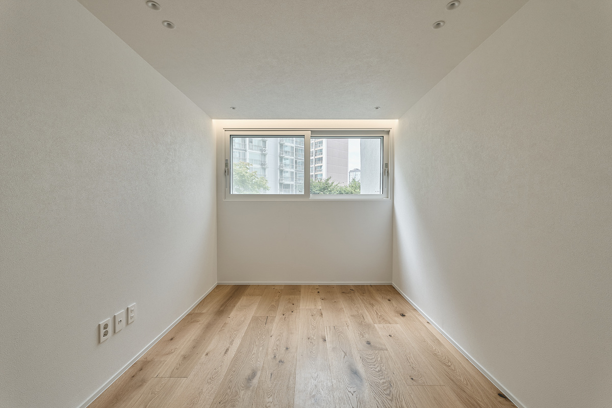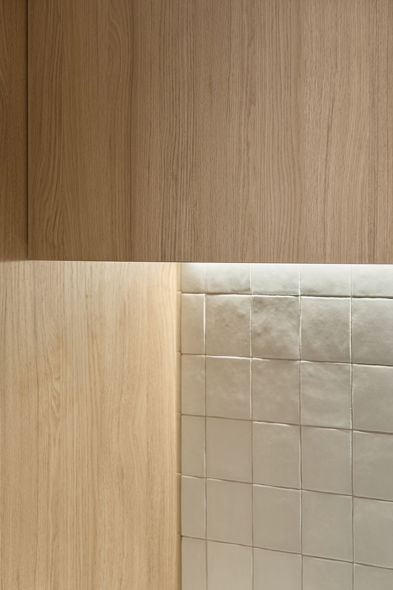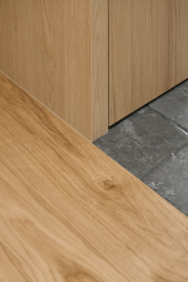 무몰딩의 미니멀한 공간감 속 촉촉한 무드의 유악타일, 따뜻한 촉감의 원목마루 등 자연스러운 소재들을 활용한 따듯한 무드의 22py 아파트 인테리어