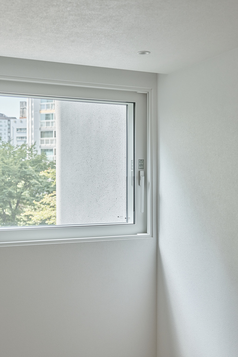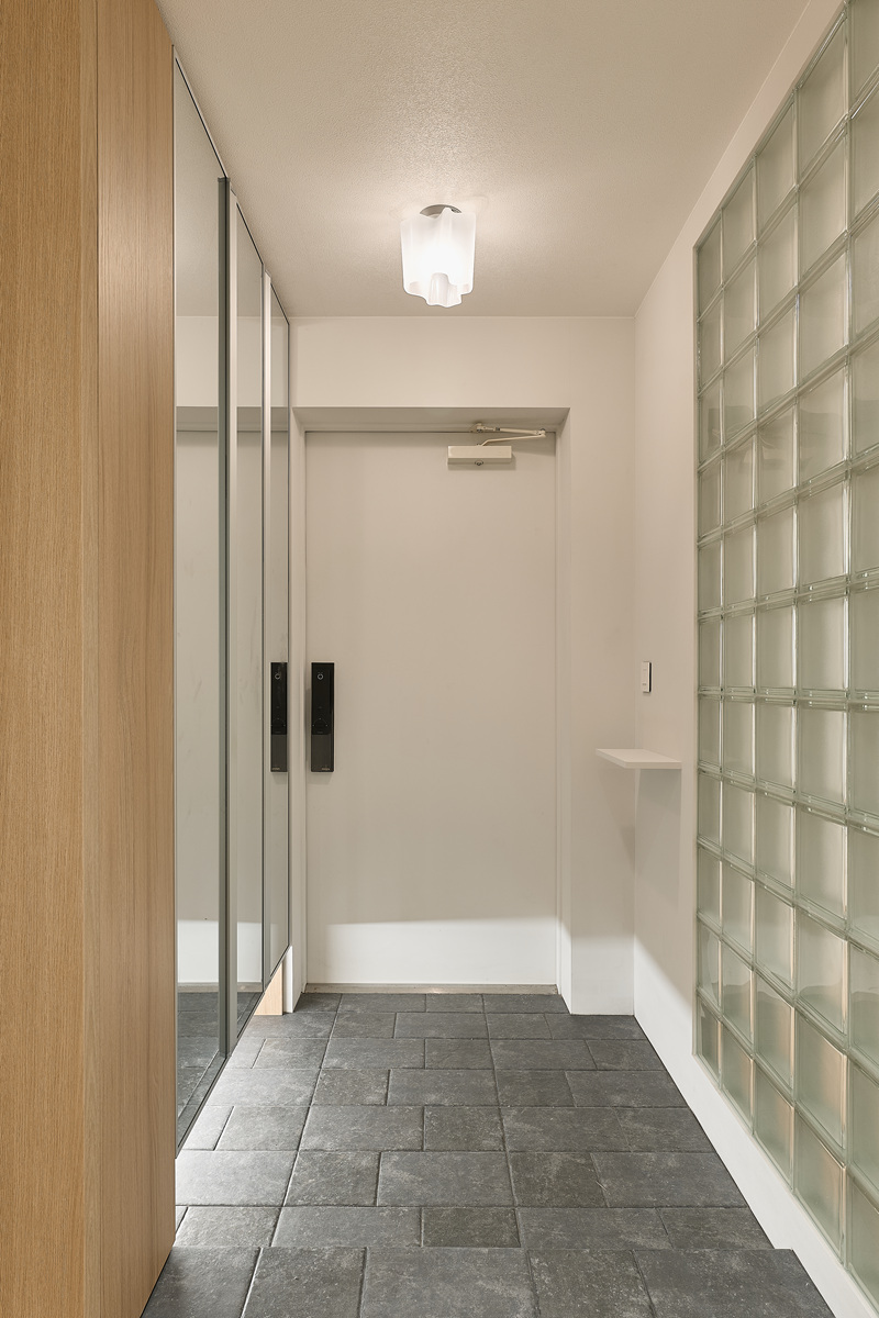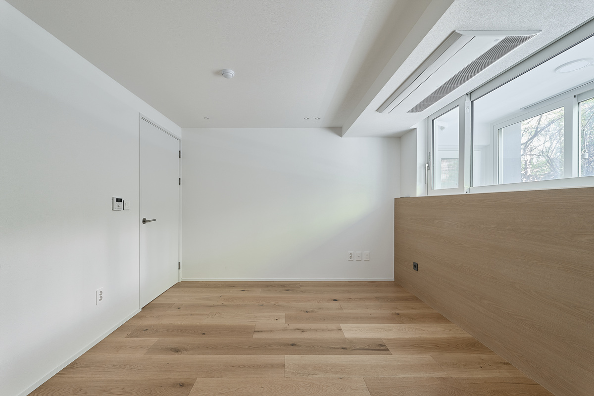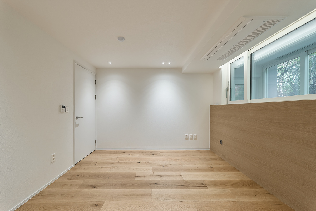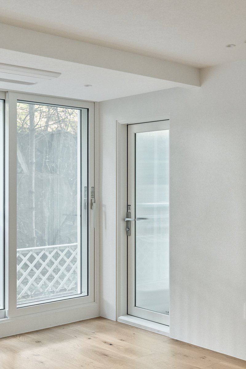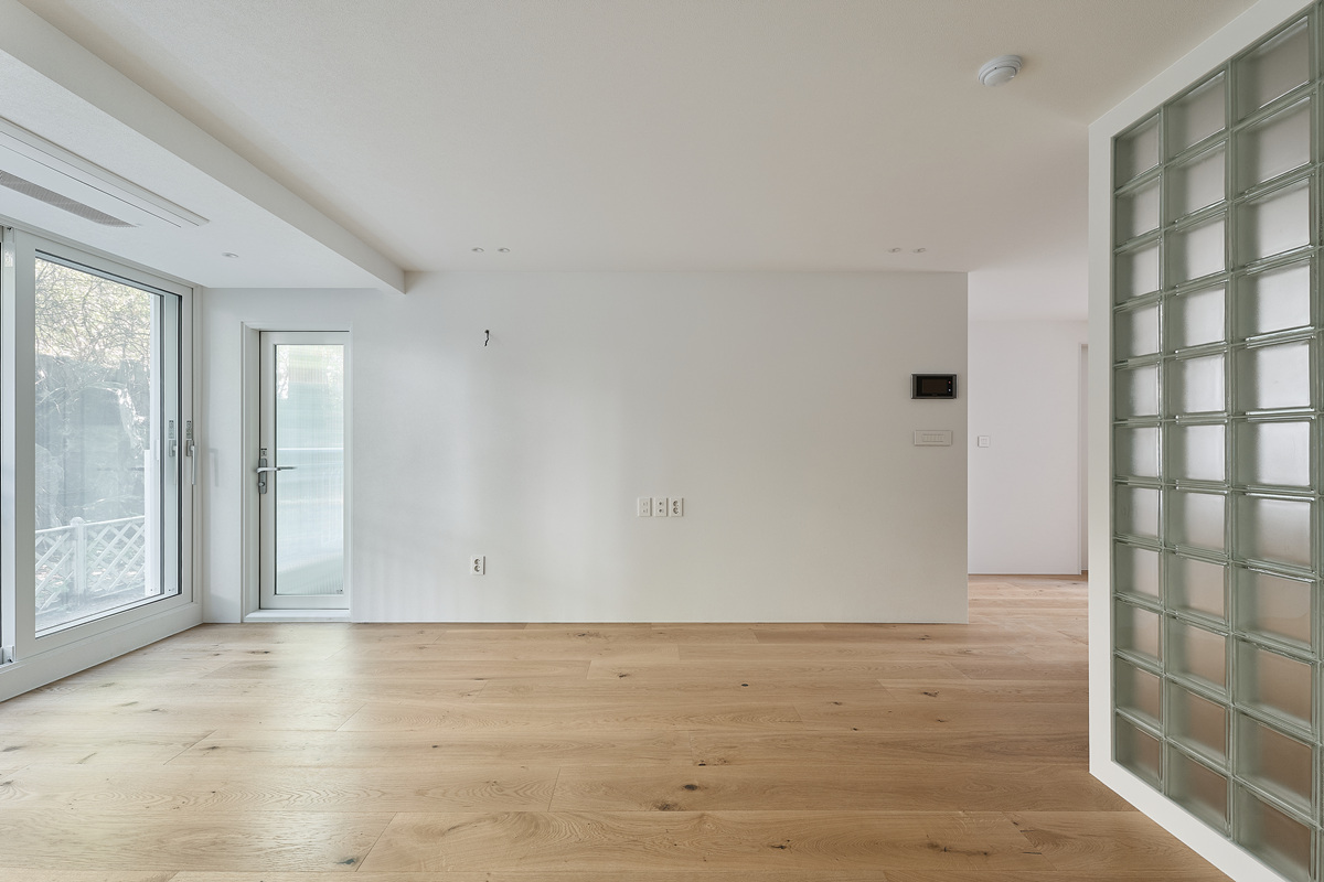 무몰딩의 미니멀한 공간감 속 촉촉한 무드의 유악타일, 따뜻한 촉감의 원목마루 등 자연스러운 소재들을 활용한 따듯한 무드의 22py 아파트 인테리어