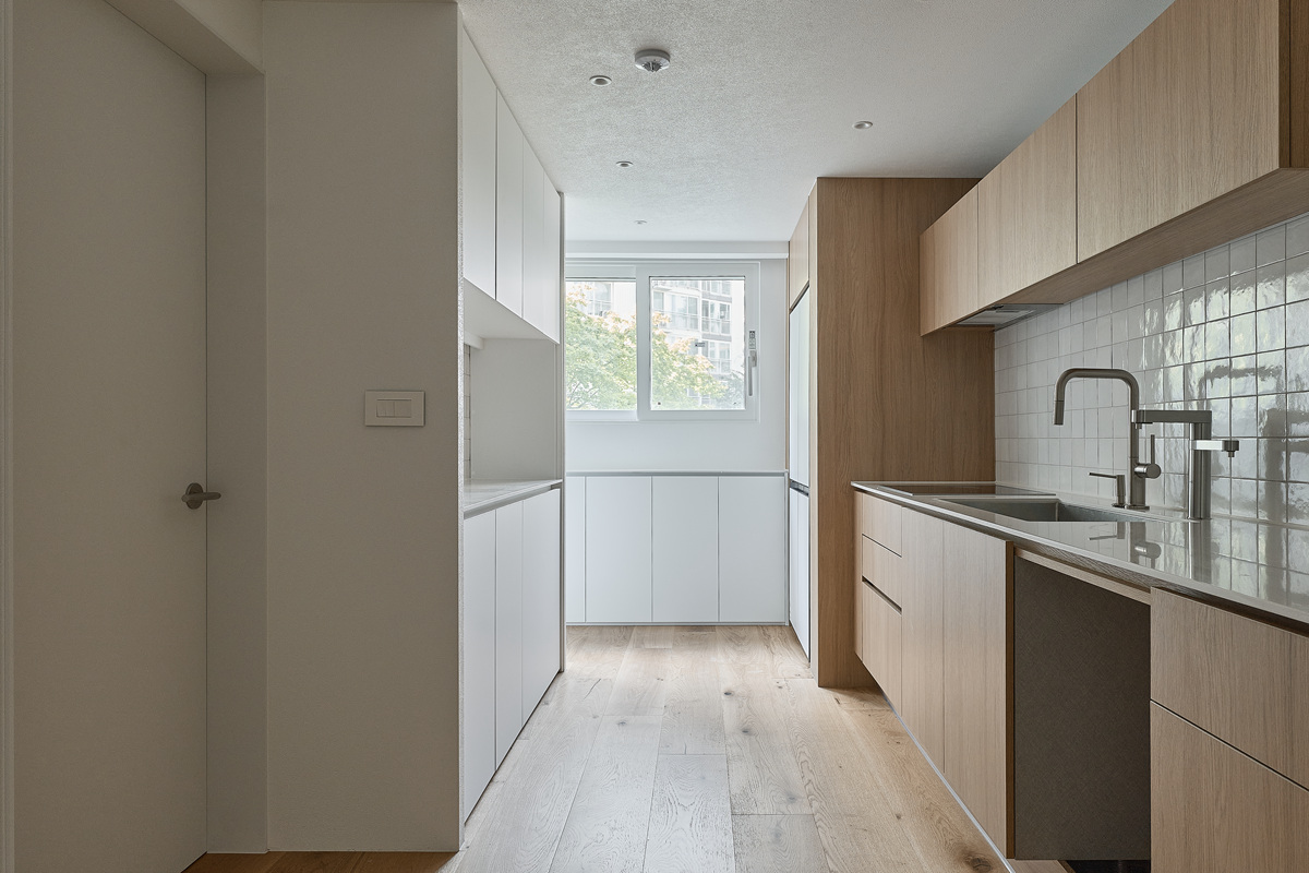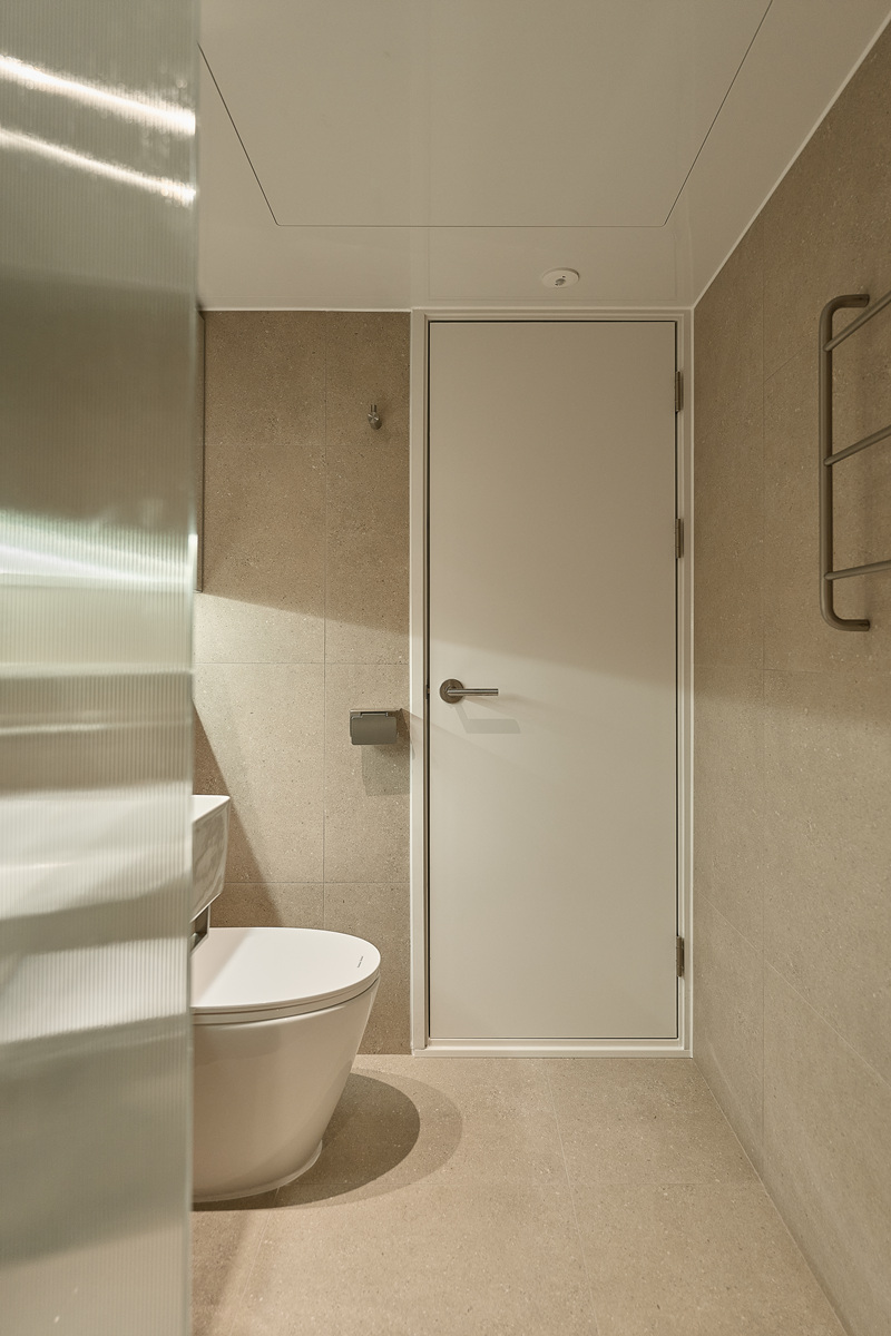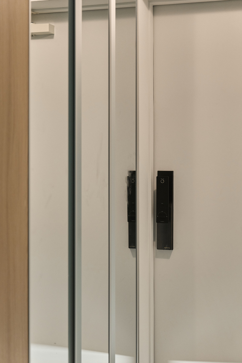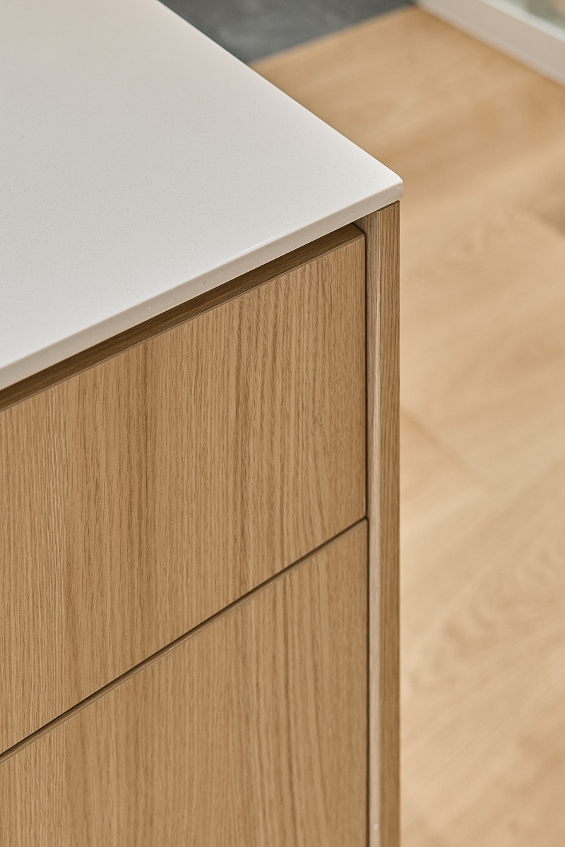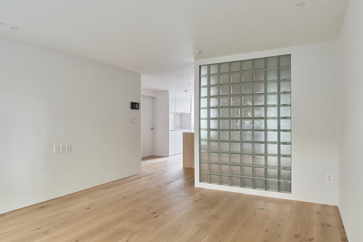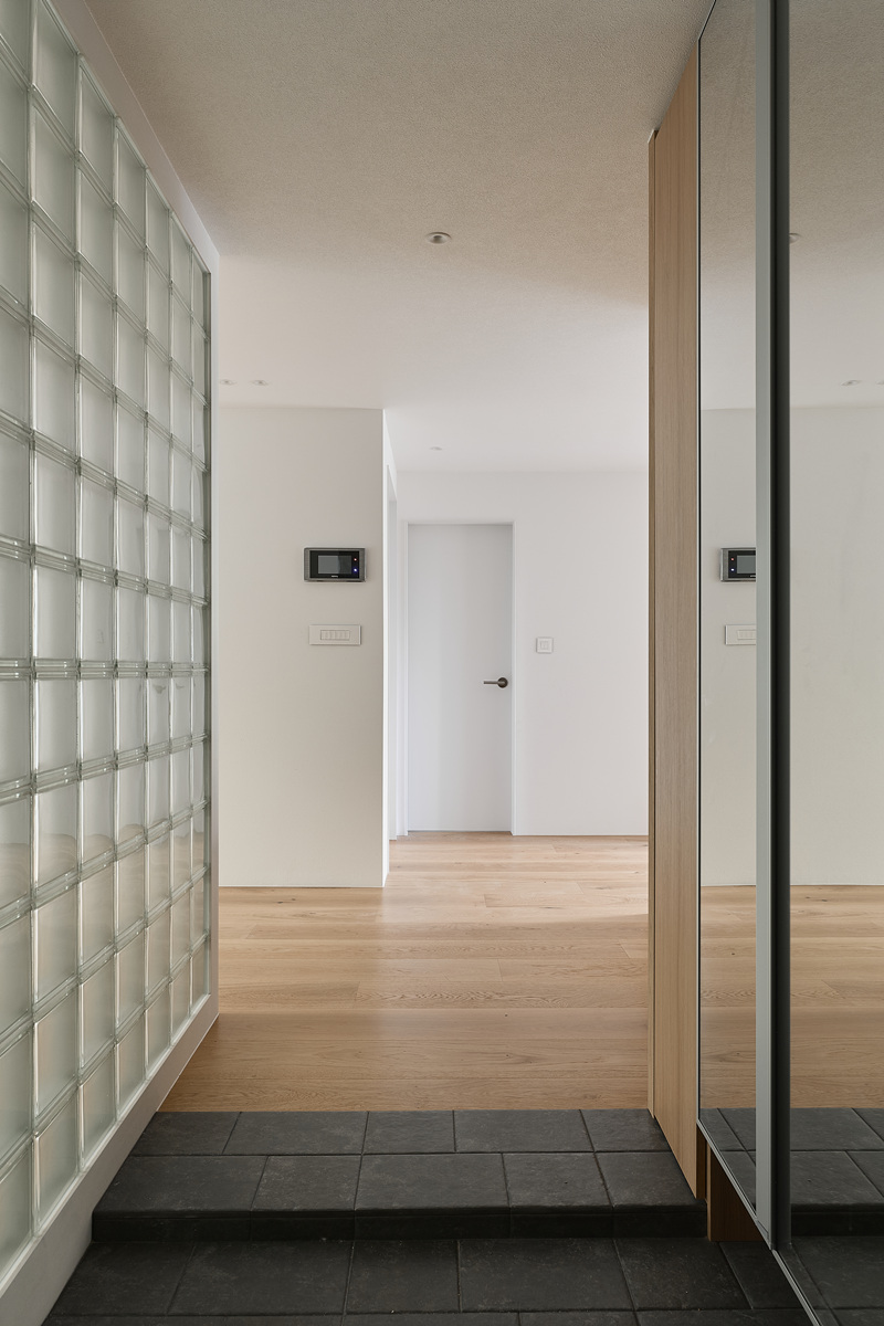 무몰딩의 미니멀한 공간감 속 촉촉한 무드의 유악타일, 따뜻한 촉감의 원목마루 등 자연스러운 소재들을 활용한 따듯한 무드의 22py 아파트 인테리어