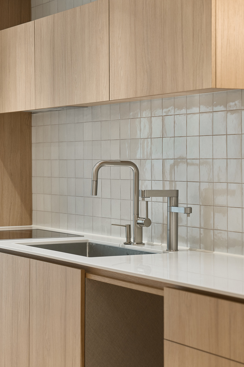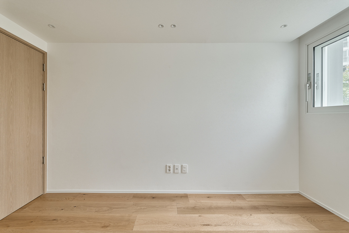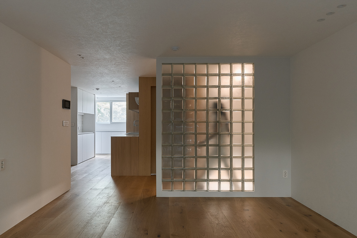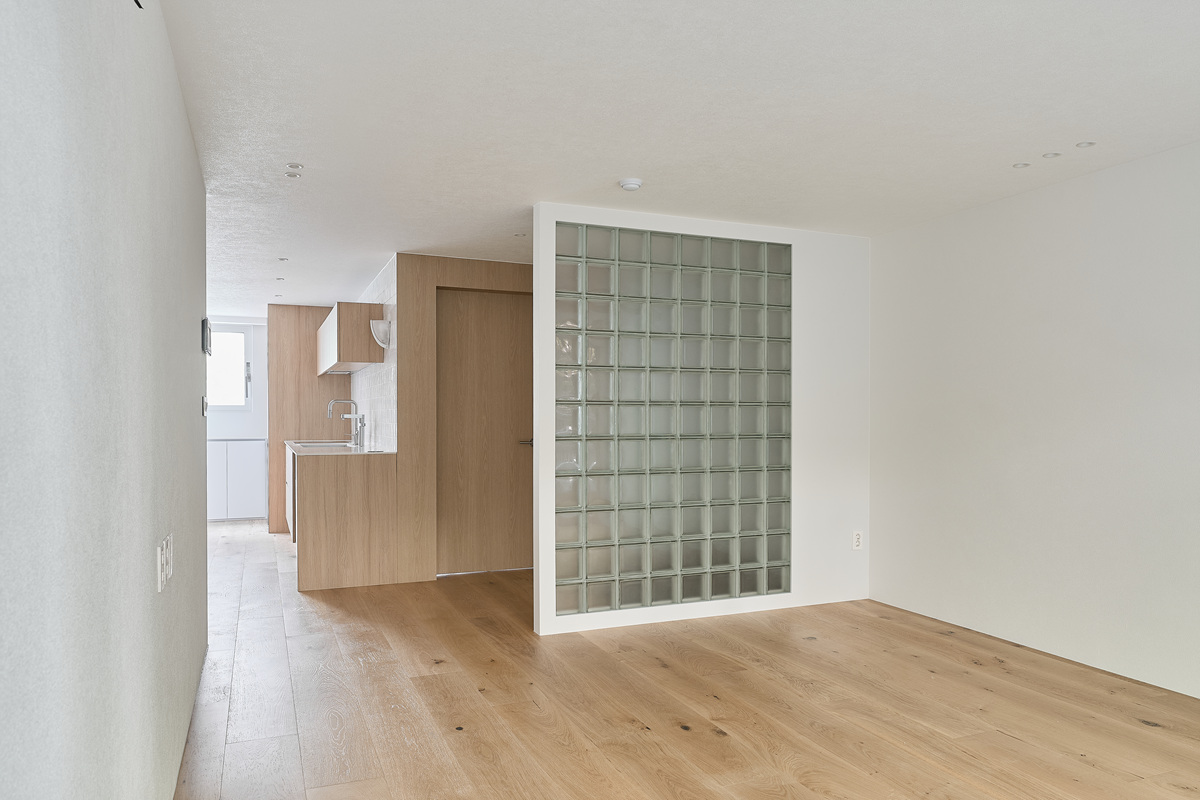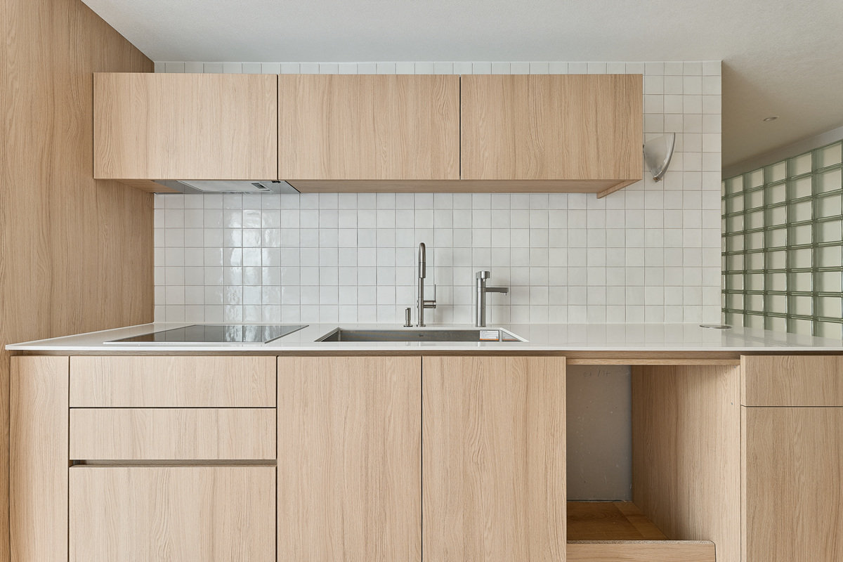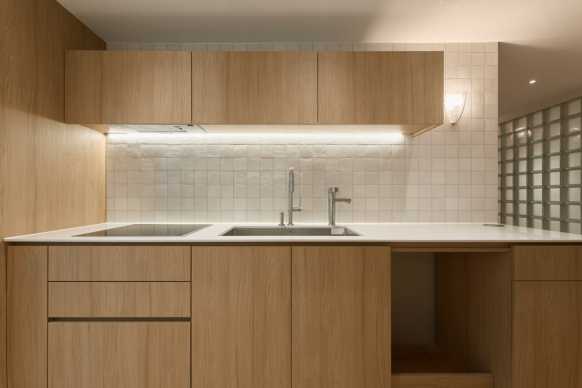 무몰딩의 미니멀한 공간감 속 촉촉한 무드의 유악타일, 따뜻한 촉감의 원목마루 등 자연스러운 소재들을 활용한 따듯한 무드의 22py 아파트 인테리어