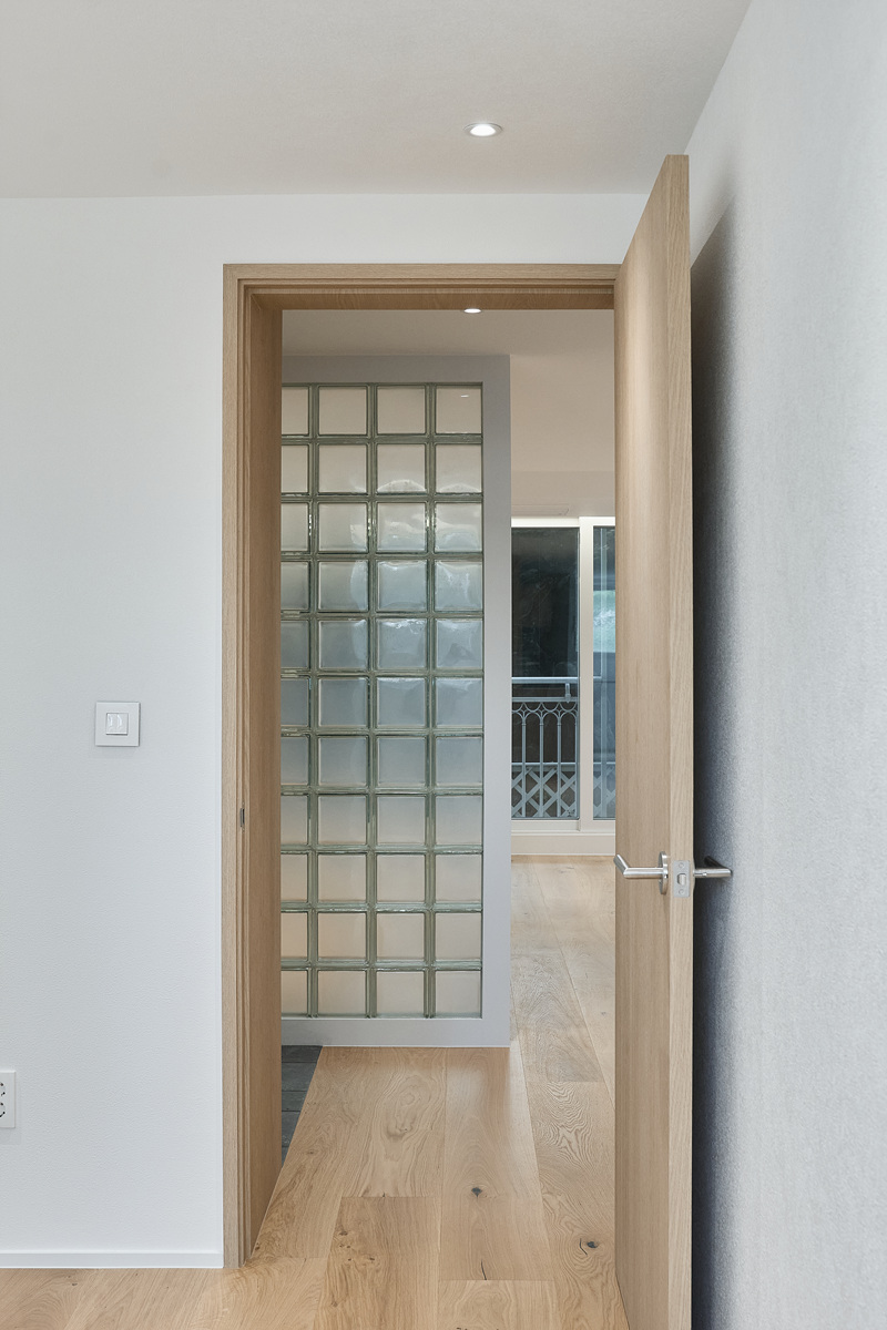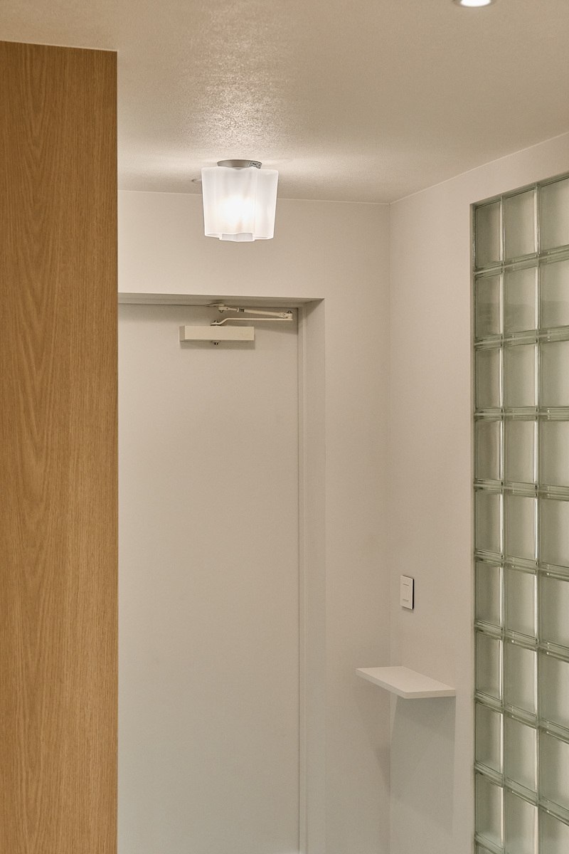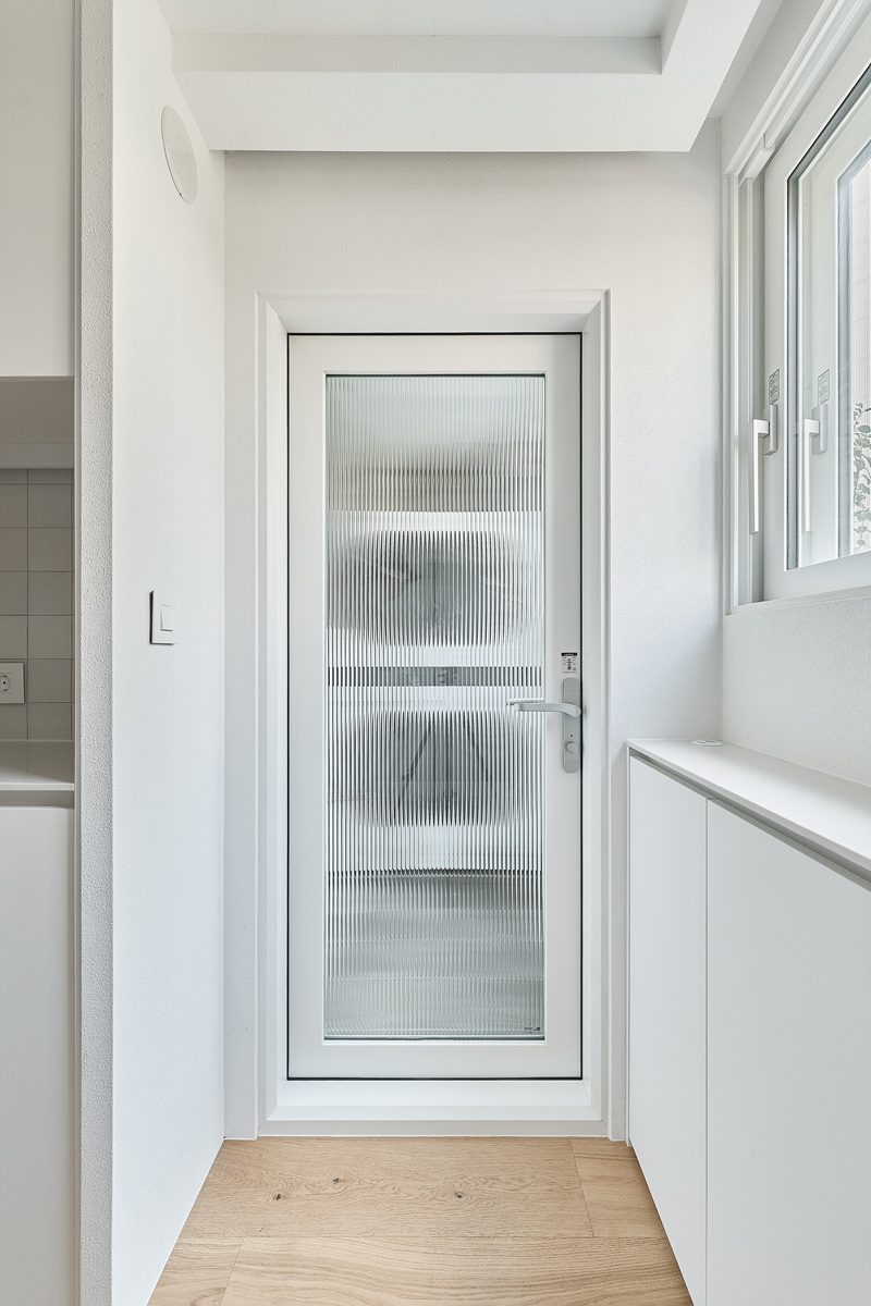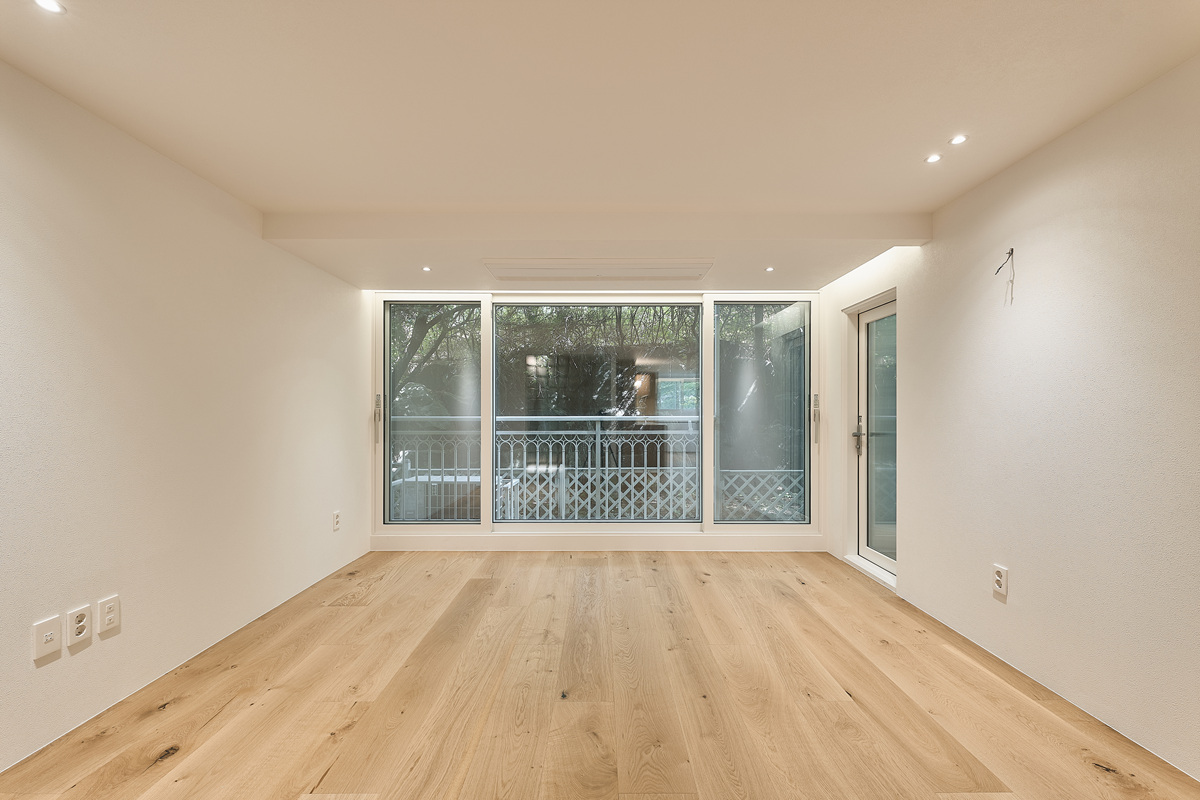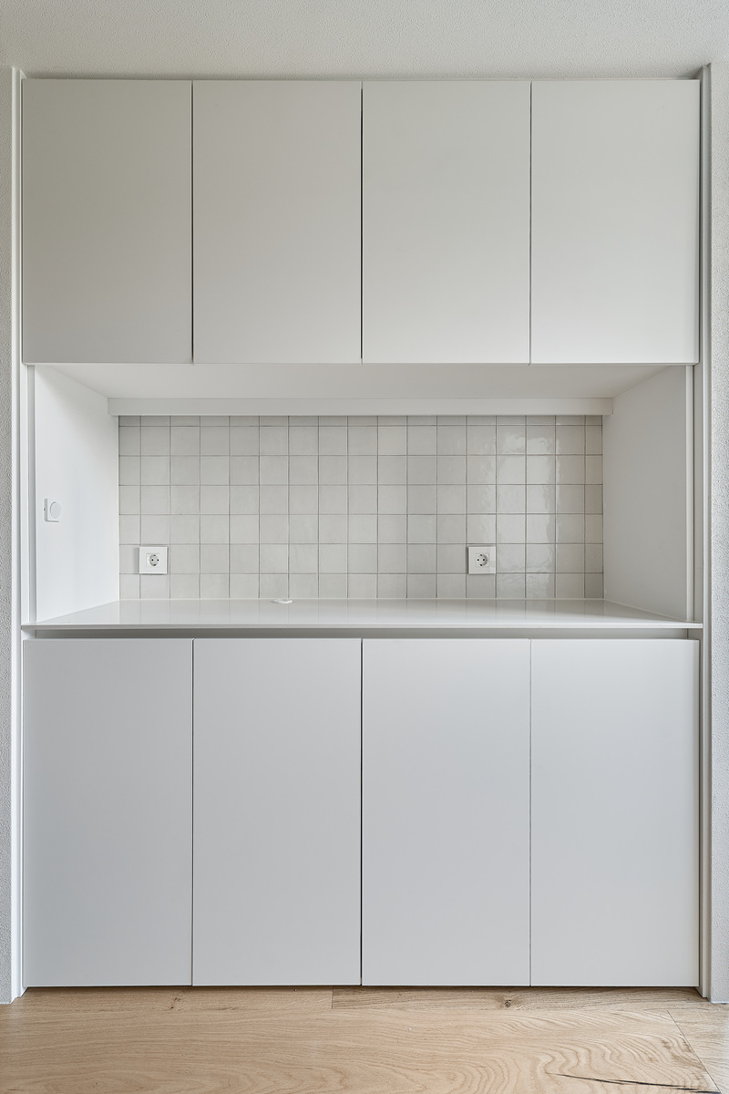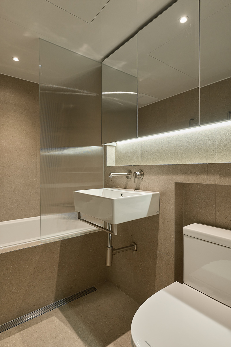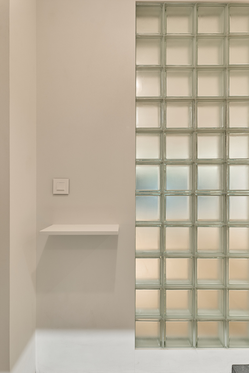 무몰딩의 미니멀한 공간감 속 촉촉한 무드의 유악타일, 따뜻한 촉감의 원목마루 등 자연스러운 소재들을 활용한 따듯한 무드의 22py 아파트 인테리어